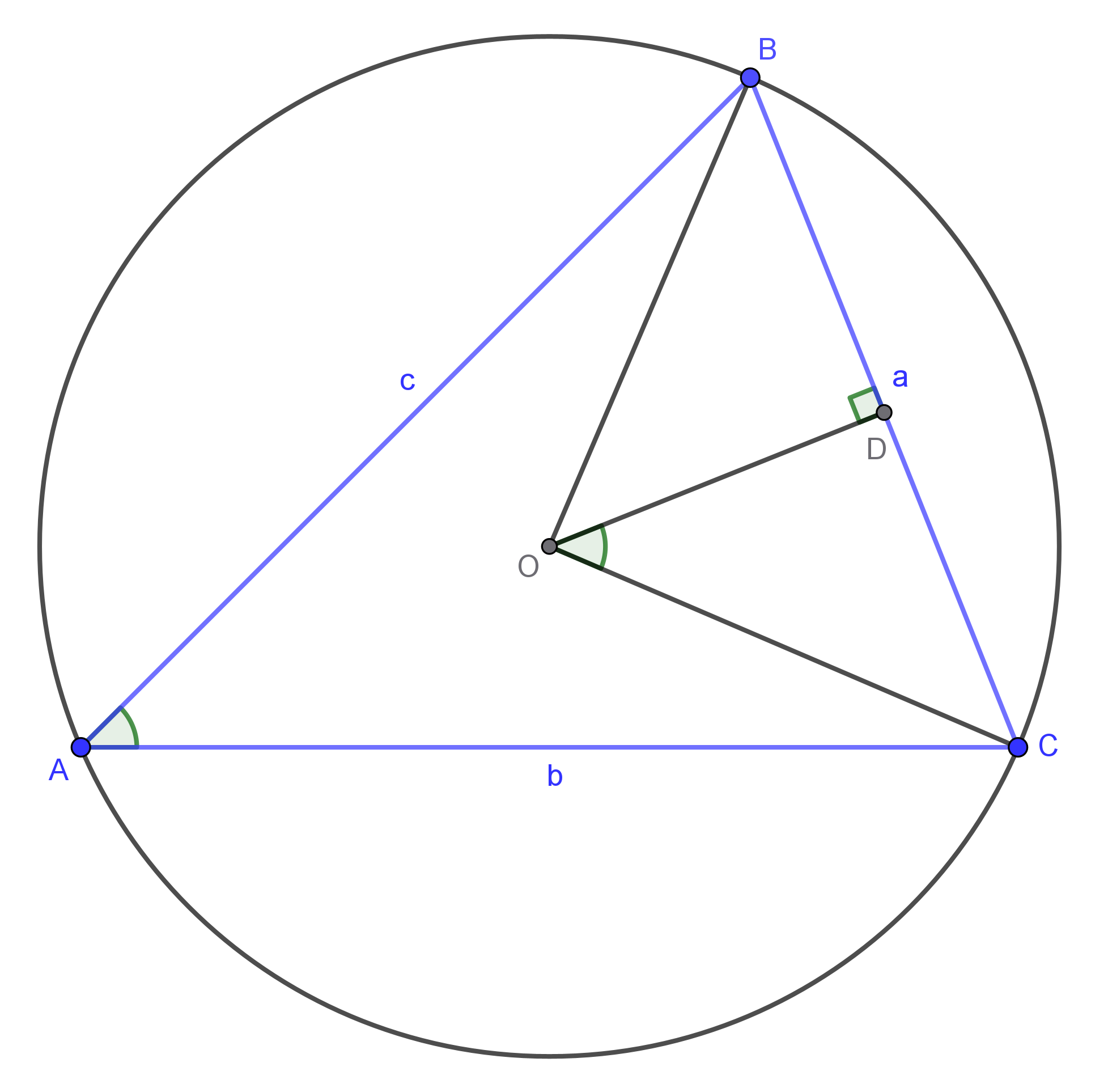 ∠A=21∠BOC∵OB=OC=R, OD⊥BC∴∠BOD=∠COD=21∠BOC=∠A∴sin∠A=sin∠COD=OCCD=R21a⟹sin∠Aa=2RSimilarly, from other directions, we may also get: